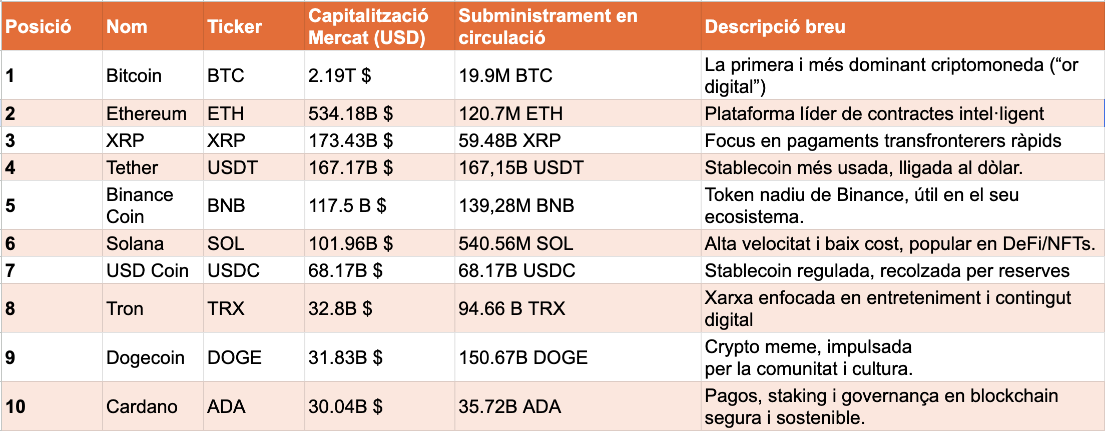 Quines són les 10 criptomonedes principals segons la seva capitalització de mercat?