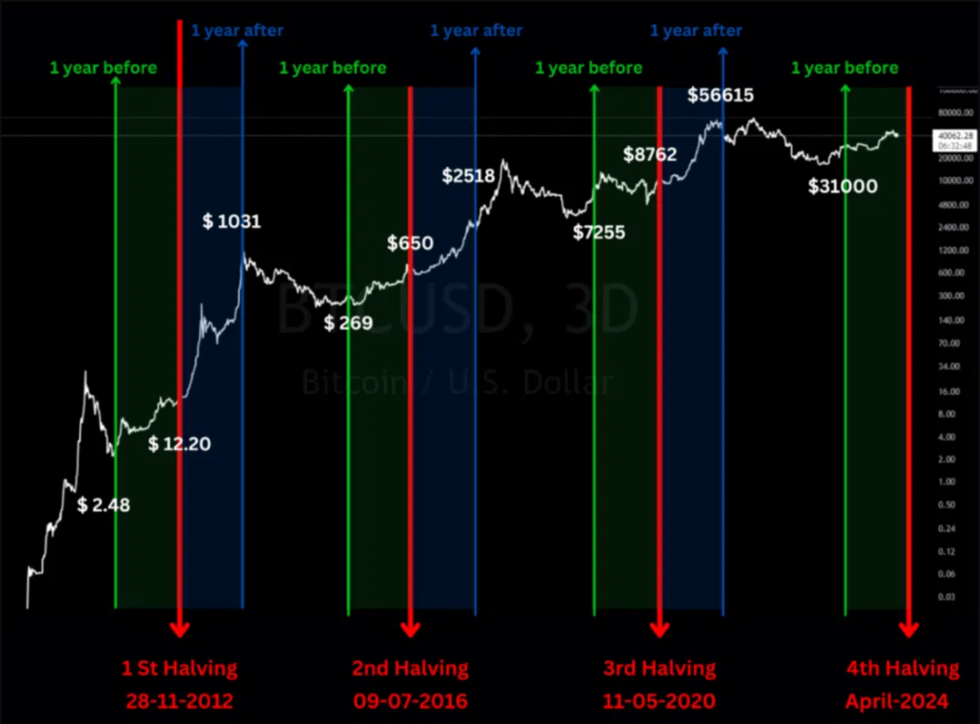 Tornant als cicles, que ens perdem amb això del halving…, és opinió gairebé general entre els analistes del sector que estem precisament en aquest moment alcista post-halving. El preu del BTC ha experimentat un augment de valor pròxim al 60% des de llavors. I el pròxim halving no arriba fins a 2028 almenys.