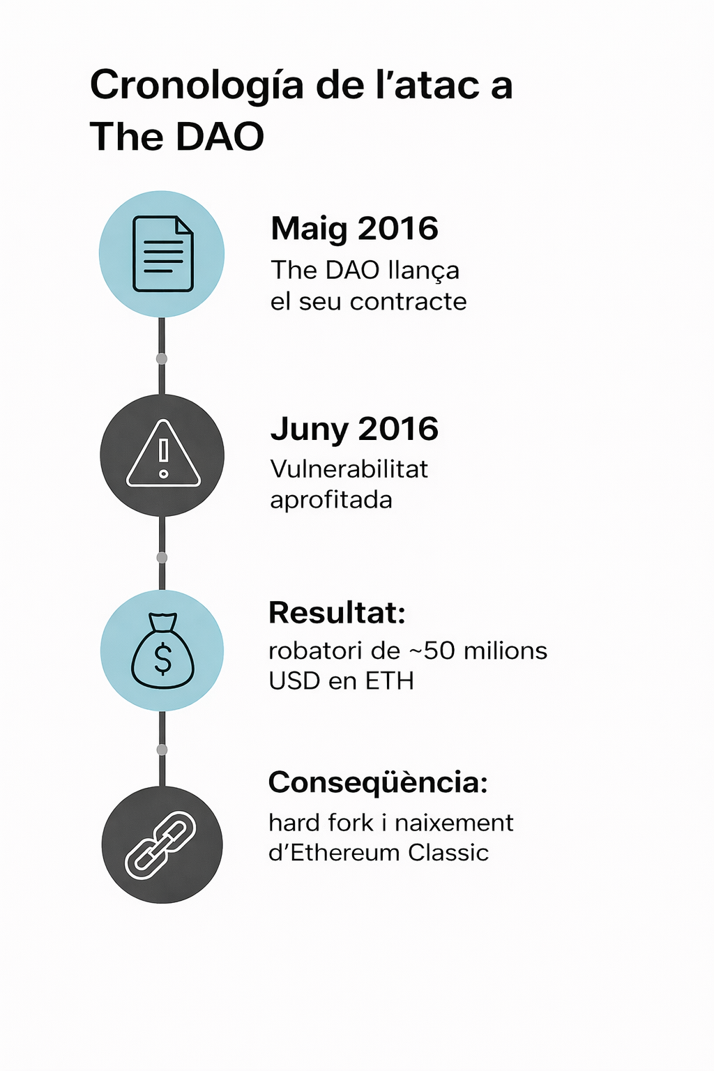 Un dels casos més famosos és el de The DAO en Ethereum. En 2016, aquesta organització descentralitzada va sofrir un atac per una vulnerabilitat trobada en un dels seus contractes. Tècnicament, el hacker no va violar cap norma, sinó que es va aprofitar de la seva inconsistència per a inclinar la balança al seu favor. L'embolic va ser tremend, ja que va permetre que milions de dòlars canviessin de mans sense que ningú pogués impedir-ho.