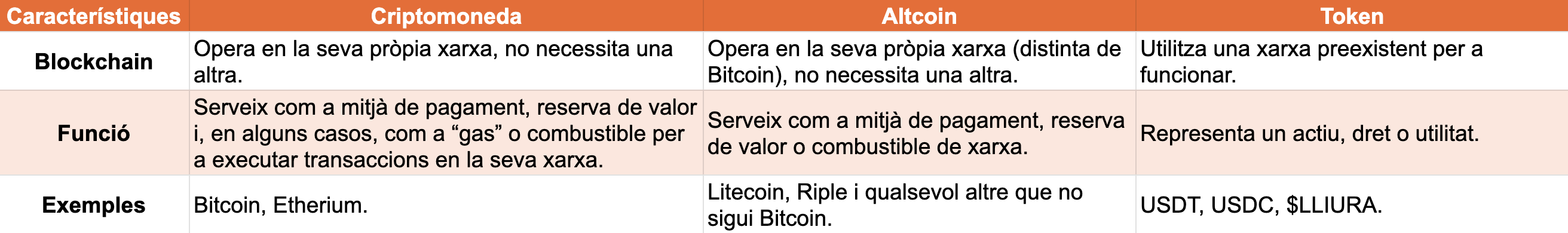 Perquè entenguis millor, creguem el següent quadre amb les principals diferències que existeixen entre una criptomoneda, una altcoins i un token: