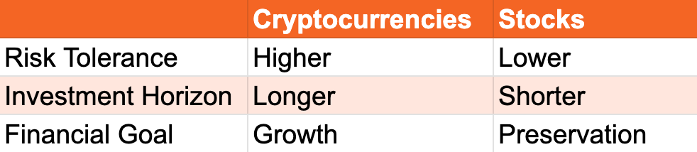 Throughout the article, we've presented investors' profiles to help you make a more informed decision between cryptocurrencies and stocks. Ultimately, those are still just general recommendations, because when it comes to investments, there is no one-size-fits-all solution.
