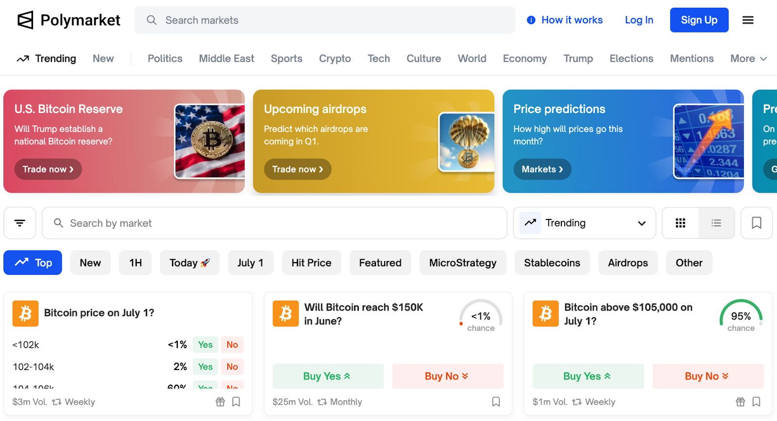 Pick a market and choose your side. In binary markets you buy Yes or No. In multi-outcome markets (e.g., an election), you can buy a specific outcome/candidate. Prices are dynamic; your cost reflects the market’s implied odds.
