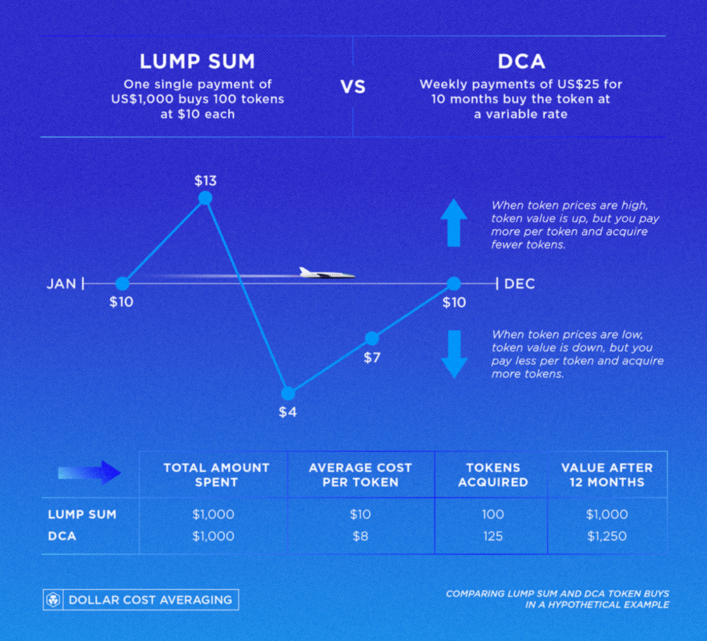 Let’s see the logic of spreading an investment over time. Imagine you invest the same amount of money at the same intervals. The dollar sum is fixed, but the amount of tokens you get changes: