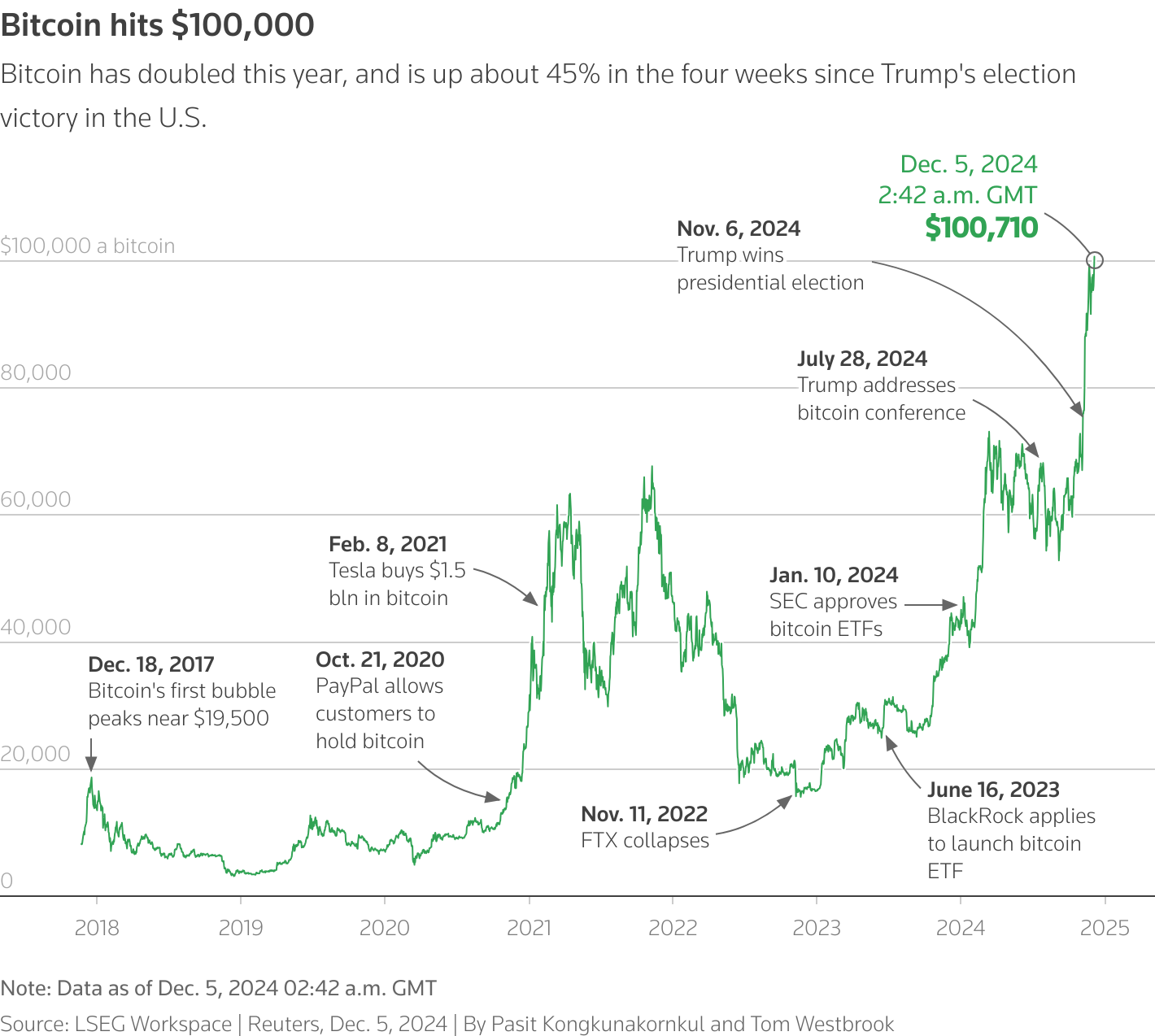 2020-2021: A new type of demand surfaced with public companies, hedge funds, and payment apps. PayPal added crypto buy/hold/sell for U.S. users in October 2020, MicroStrategy kicked off the corporate-treasury playbook, and Tesla disclosed a $1.5 billion purchase in February 2021.