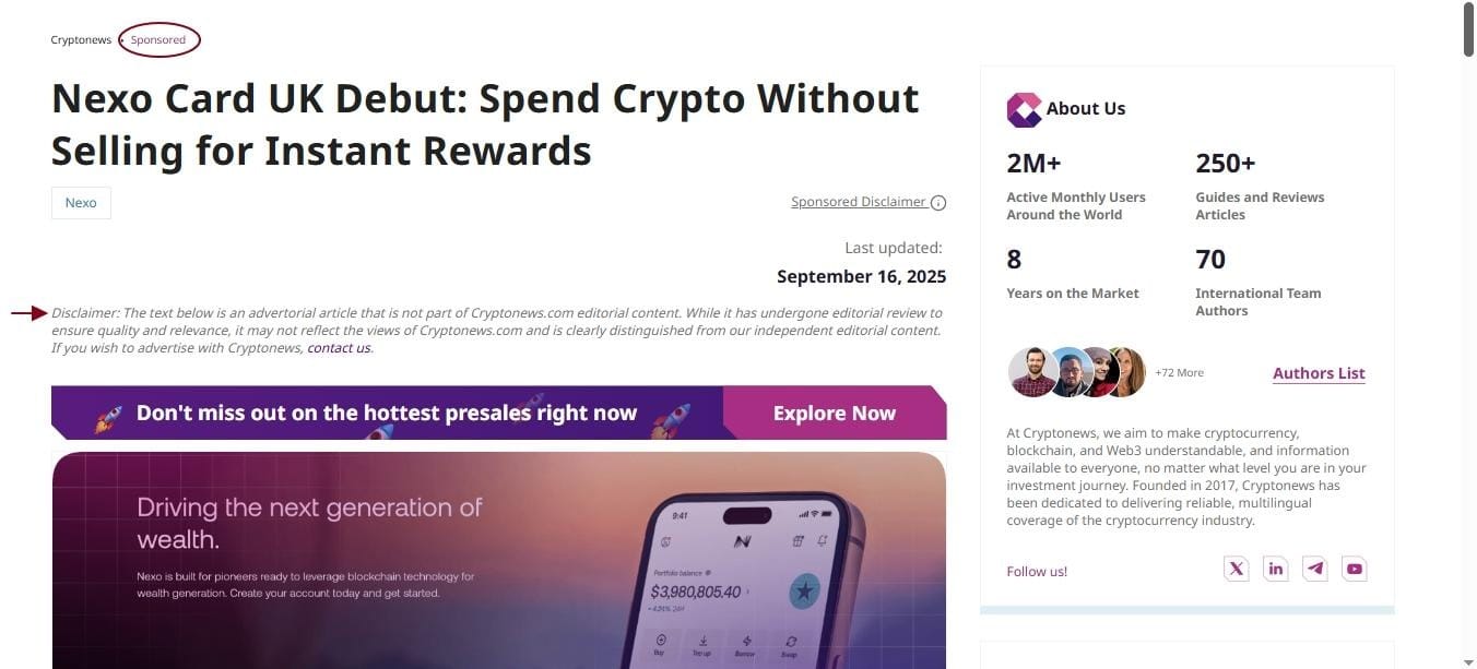 Social media, by the way, is all good and nice to start checking on a crypto project, but never trust only in it. Check external reviews, official documents, and, if you can read them, source codes on platforms like GitHub. Make sure that the sources you find aren’t sponsored (paid) by the same brand. This type of article is often identified as such at the beginning or the end.