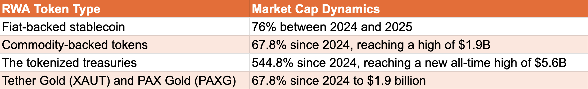 - Fiat-backed stablecoins. USDT remains dominant, while EURT, USDC, EURC, USDtb, and USD0 gain traction.