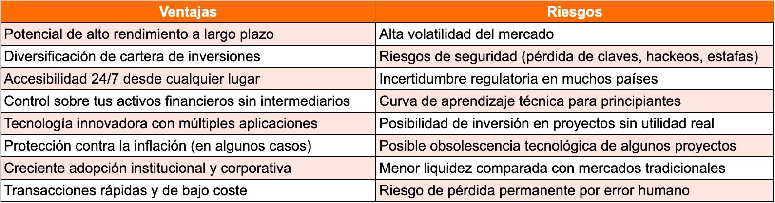 Tabla resumen con ventajas y riesgos de invertir en criptomonedas