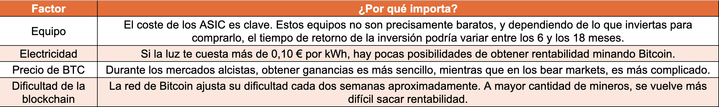 Si, pese a todos los obstáculos, te interesa emprender tu aventura en la minería de Bitcoin, echa un vistazo a esta tabla que recoge los factores que afectarán la rentabilidad de tu negocio: