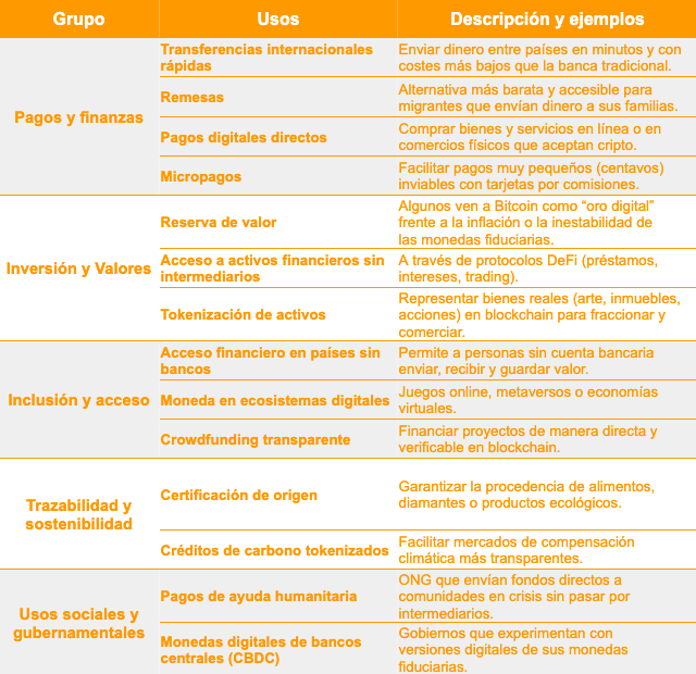 - Para transferencias internacionales rápidas o acceso financiero en países sin bancos es mucho más útil y fácil de manejar que cualquier otra divisa.