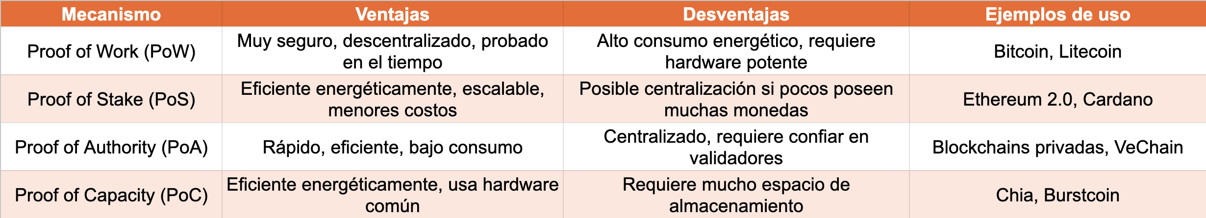 Todos los mecanismos de consenso tienen tanto sus pros como sus contras. Por lo tanto, cada uno se utiliza con un objetivo diferente, tal y como podemos ver en la siguiente tabla.