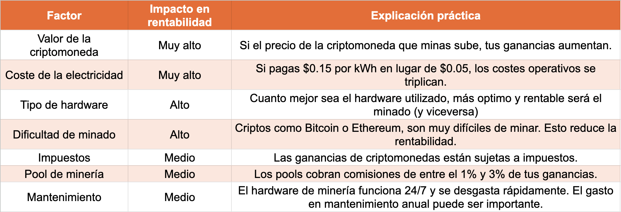 Después de todo lo que hemos visto, puedes pensar que minar criptomonedas es una manera sencilla de obtener ingresos pasivos. Pues ojo porque no es tan sencillo. La rentabilidad de la criptominería depende de muchos factores variables que debes valorar. Estos son: